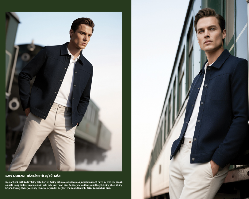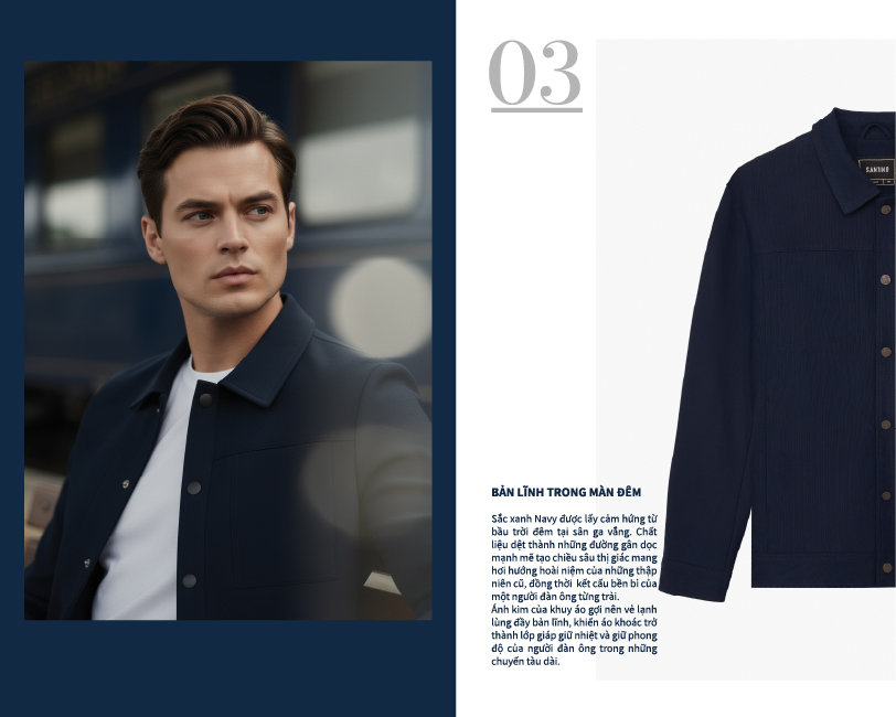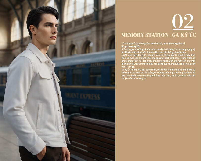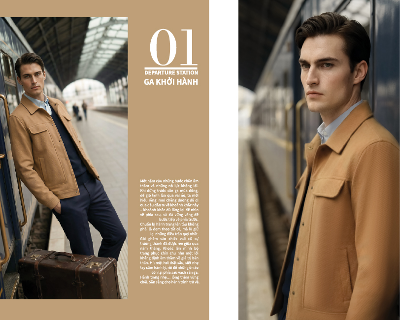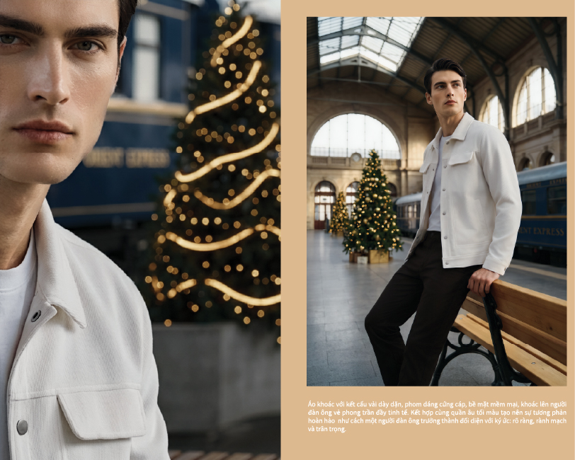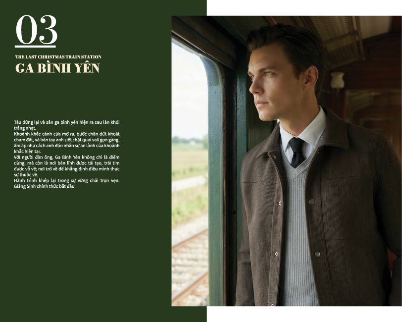 Ga Khởi Hành đại diện cho tinh thần sẵn sàng bước vào mùa lễ. Các thiết kế mang gam màu lạnh, phom dáng gọn gàng, cấu trúc vững vàng và đường nét tinh tế giúp người đàn ông giữ trọn phong thái lịch lãm trong những sự kiện cuối năm.
